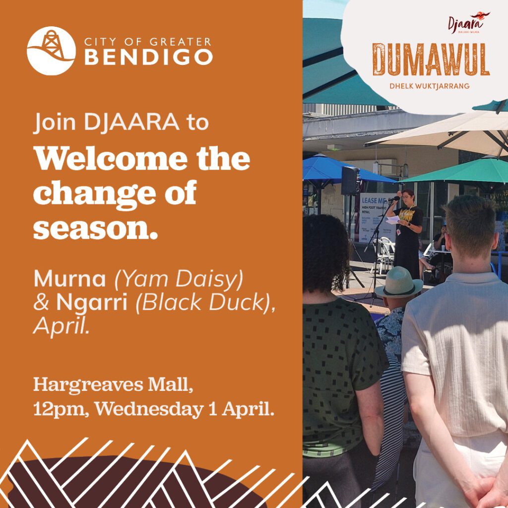 DUMAWUL and City of Greater Bendigo have hosted these lunchtime gatherings at 12pm in Hargreaves Mall, Bendigo, honouring Dja Dja Wurrung knowledge, Culture, and Country.