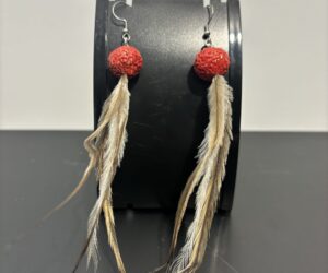 Red painted quandong seed and feather earrings handmade by Suzanne Taylor