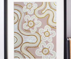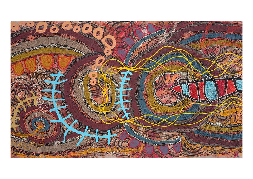 Walking on Country Series: This collection portrays underground water systems and natural ochre deposits, capturing the shimmering essence of shallow water pools. Integrating imagery of dilly bags, Jackie pays homage to traditional weaving practices and the enduring role of women as cultural caretakers.