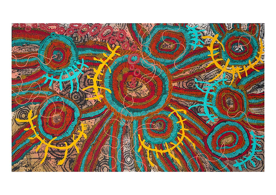 Walking on Country Series: This collection portrays underground water systems and natural ochre deposits, capturing the shimmering essence of shallow water pools. Integrating imagery of dilly bags, Jackie pays homage to traditional weaving practices and the enduring role of women as cultural caretakers.
