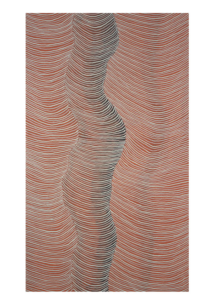 Waḻpa Winaka, which translates as “to burn and leave.” Rooted in cultural fire practices, the series explores regeneration through seasonal burning: clearing the land of toxins, inviting fresh shoots, and restoring balance. Waḻpa Winaka also speaks to the artist’s personal journey—an inner burn‑off that sheds unneeded burdens with old stories and clutter , making space for a fertile, forward‑moving life. Its layered fields and mapped firelines hold both the pragmatics of caring for Country and the ethics of renewal, carrying a teaching that moves between land, kin, and self.